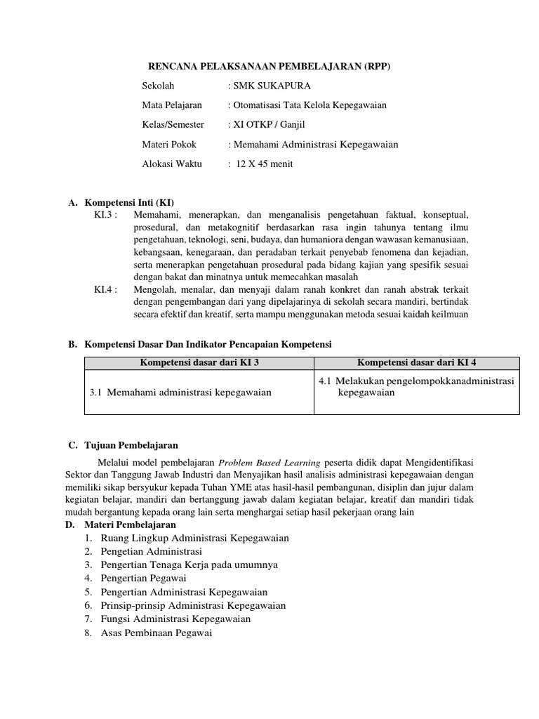 Rpp 1 Lembar Otomatisasi Tata Kelola Kepegawaian Kelas Xi Smk Kurikulum 2013 Revisi 2020 Smk Indonesia 1